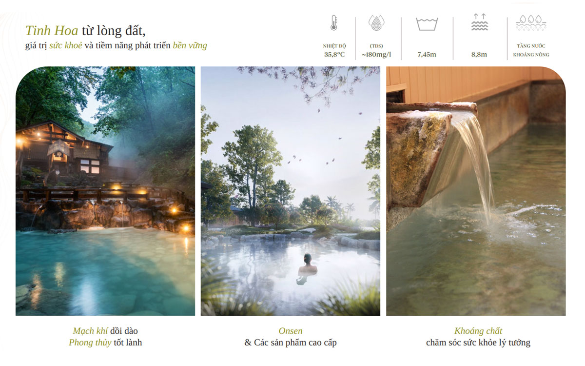 Giữa nhịp sống đô thị hối hả, con người ngày càng tìm về những giá trị nguyên bản nơi thiên nhiên và sức khỏe được đặt làm trung tâm. Và giữa vùng đất hiền hòa Hưng Yên, Alluvia Onsen đã lặng lẽ khai mở một món quà quý giá từ lòng đất. Đó chính là nguồn khoáng nóng Onsen nguồn khoáng nóng quý giá hội tụ đầy đủ các tiêu chí lý tưởng để phát triển thành một khu đô thị nghỉ dưỡng – trị liệu chuẩn Nhật giữa miền Bắc Việt Nam.