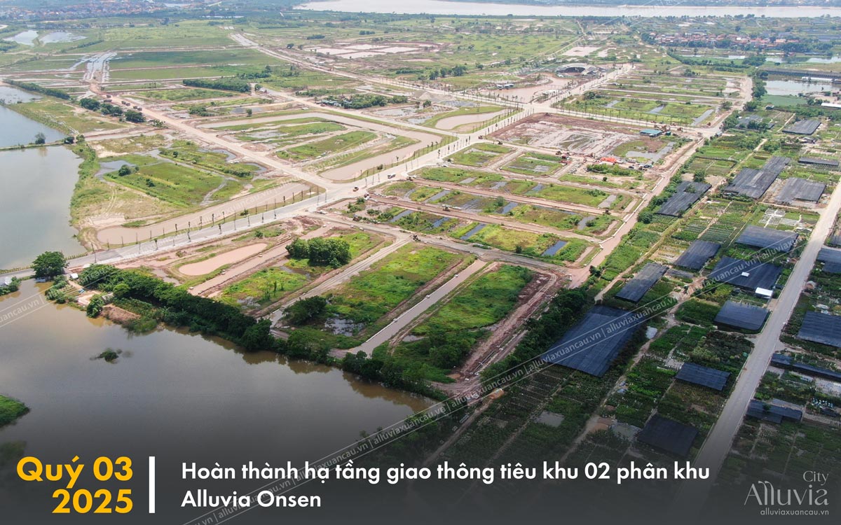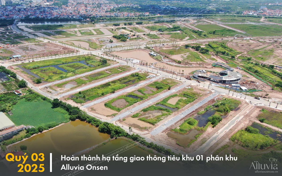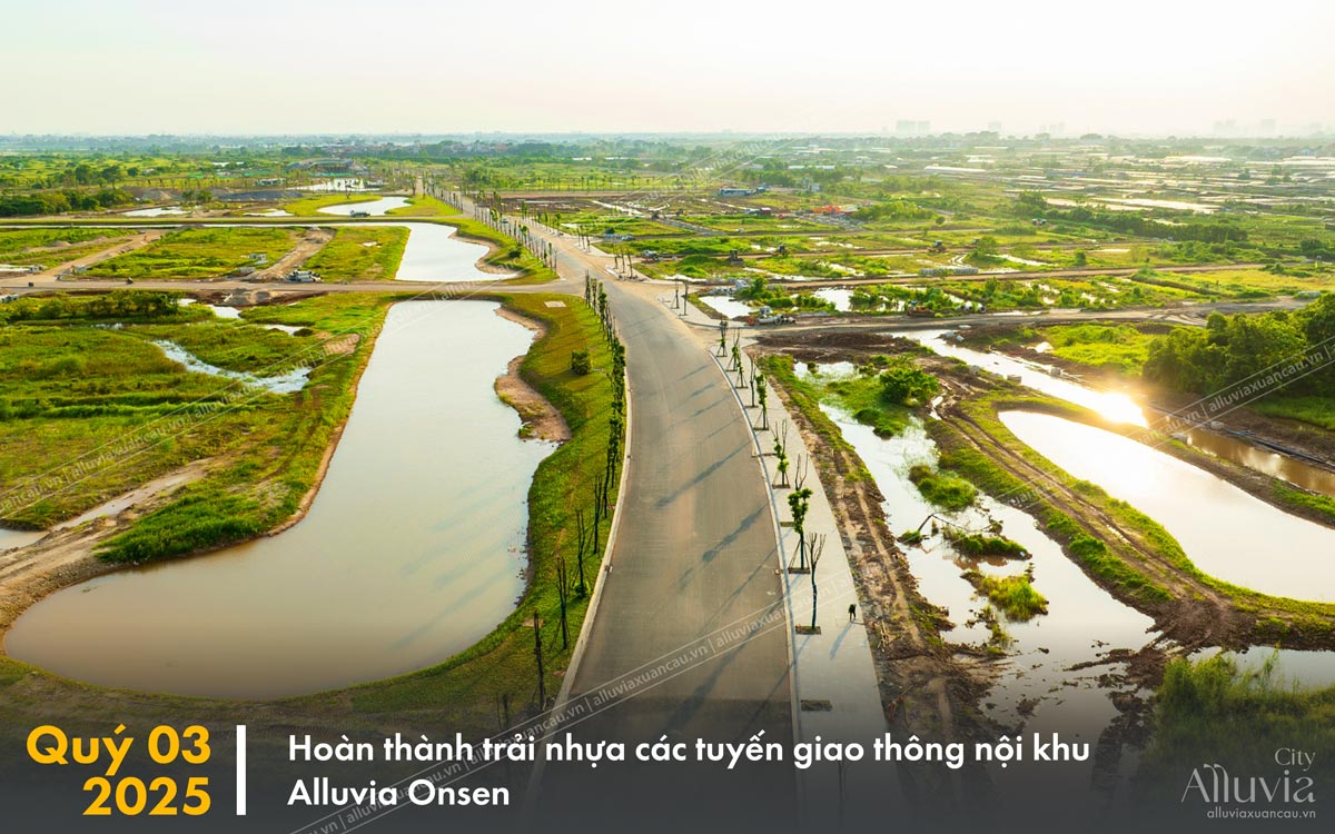 Phân khu Alluvia Onsen hiện đang ghi dấu những bước tiến vượt bậc trong quá trình triển khai. Toàn bộ mặt bằng dự án đã được giải phóng hoàn toàn, tạo tiền đề cho việc thi công đồng bộ. Các trục giao thông huyết mạch dần hiện hữu với hơn 80% tuyến đường đã được trải nhựa, kết nối liền mạch toàn khu. Bên cạnh đó, tổ hợp nhà mẫu đã hoàn tất phần thô và đang gấp rút hoàn thiện các hạng mục ngoại thất để sớm sẵn sàng chào đón khách tham quan. Không gian cảnh quan với hồ nước và mảng xanh cũng đang được triển khai nhanh chóng, hứa hẹn mang đến diện mạo sống động, khoáng đạt cho toàn phân khu.